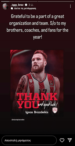 Την ίδια ώρα, ο Ίγκνας Μπραζντέικις αποχώρησε από τους Πειραιώτες και από την επόμενη σεζόν θα αγωνίζεται με τη φανέλα της Ζαλγκίρις Κάουνας. Ο Λιθουανός δεν κατάφερε να εκπληρώσει τις προσδοκίες της μεταγραφής του το περσινό καλοκαίρι και περιορίστηκε στους 3.6 πόντους και 1.7 ριμπάουντ μέσο όρο, σε 11 λεπτά συμμετοχής ανά παιχνίδι στο κουπόνι της Euroleague.