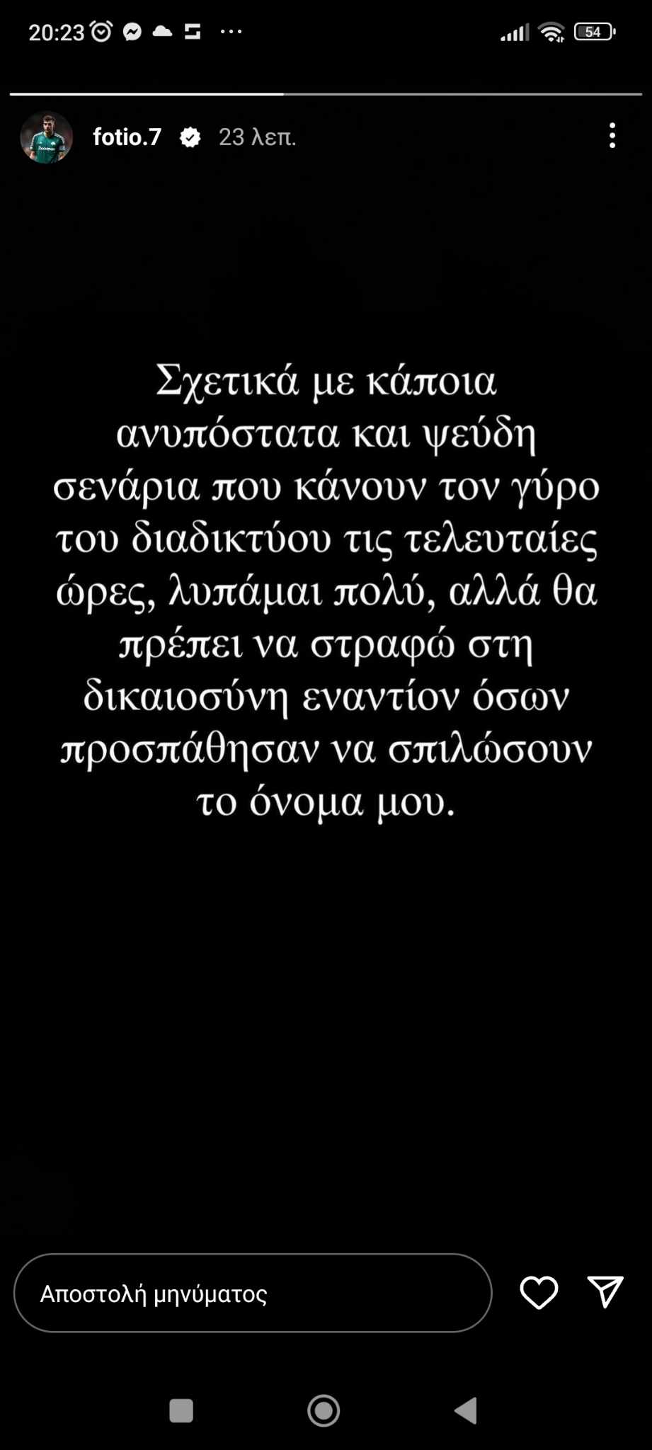 Ο 24χρονος επιθετικός του Παναθηναϊκού ανήρτησε σχετική ιστορία στον προσωπικό του λογαριασμό στο instagram, όπου αναφέρει πως θα ακολουθήσει τη νομική οδό: