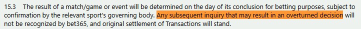 Η Bet365 αναφέρει ρηττά πως: «οποιαδήποτε έρευνα που μπορεί να οδηγήσει σε ανατροπή απόφασης δεν θα αναγνωρίζεται και θα ισχύει η αρχική διευθέτηση των συναλλαγών».