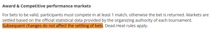 Σύμφωνα με τα όσα αναφέρει η Novibet, ισχύουν οι ίδιοι κανονισμοί. «Επόμενες αλλαγές δεν επηρεάζουν την διευθέτηση των στοιχημάτων», αναφέρεται στην παράγραφο για τις σχετικές αγορές.
