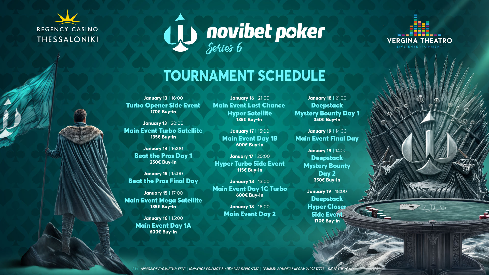 Το Novibet Poker Series 6 θα πραγματοποιηθεί στο Vergina Theatro του Regency Casino Thessaloniki στις 13-19 Ιανουαρίου. Το πρόγραμμα μεγαλύτερο από ποτέ, με πλήθος επιλογών για τους λάτρεις του πόκερ που αναμένεται να ταξιδέψουν και πάλι από όλη την Ελλάδα αλλά και το εξωτερικό για να δώσουν το «παρών» στο φεστιβάλ που σπάει όλα τα ρεκόρ.