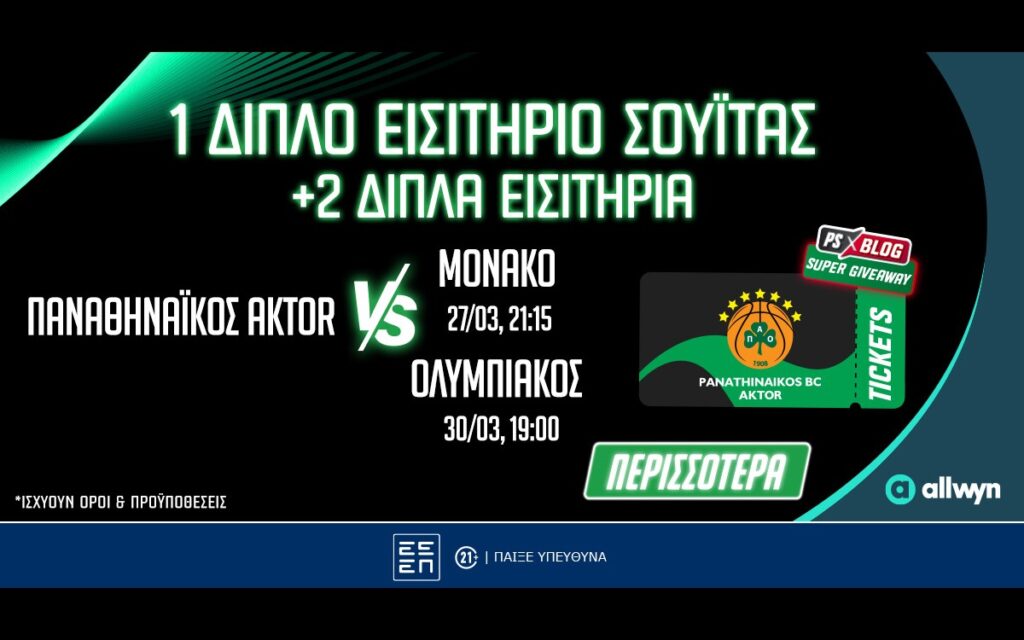 Με τον σούπερ διαγωνισμό του PS Blog ζεις δύο τεράστιες μπασκετικές βραδιές στο “Telecom Center Athens”, βλέποντας από σουίτα τα παιχνίδια του Παναθηναϊκού AKTOR με τη Μονακό (27/03, 21:15) και τον Ολυμπιακό (30/03, 19:00).