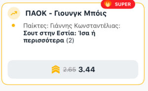 Η Winmasters με τη σειρά της, έπαιξε με την… καρδιά μας και χρησιμοποίησε τον Γιάννη Κωνσταντέλια στις σούπερ ενισχυμένες της. Ο πιο απειλητικός παίκτης του ΠΑΟΚ, θα «πλήρωνε» στο 2.65 αν καταφέρει να κάνει τουλάχιστον δύο σουτ στην εστία. Πλέον το ενδεχόμενο αυτό ανέβηκε στο 3.44 και αποτελεί μία φοβερή επιλογή.