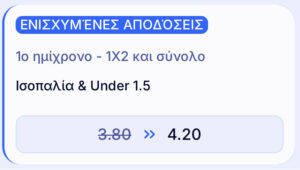 Αν δεν βλέπεις όμως ένα επιθετικό παιχνίδι με θέαμα μην αγχώνεσαι! Η Elabet σου έχει τη λύση. Η καινούρια ελληνική στοιχηματική, προσφέρει τεράστια ποικιλία επιλογών στις ενισχυμένες. Για τους… λάτρεις του Under, το 0-0 στο ημίχρονο έχει πάει στο 4.20 από το 3.80.