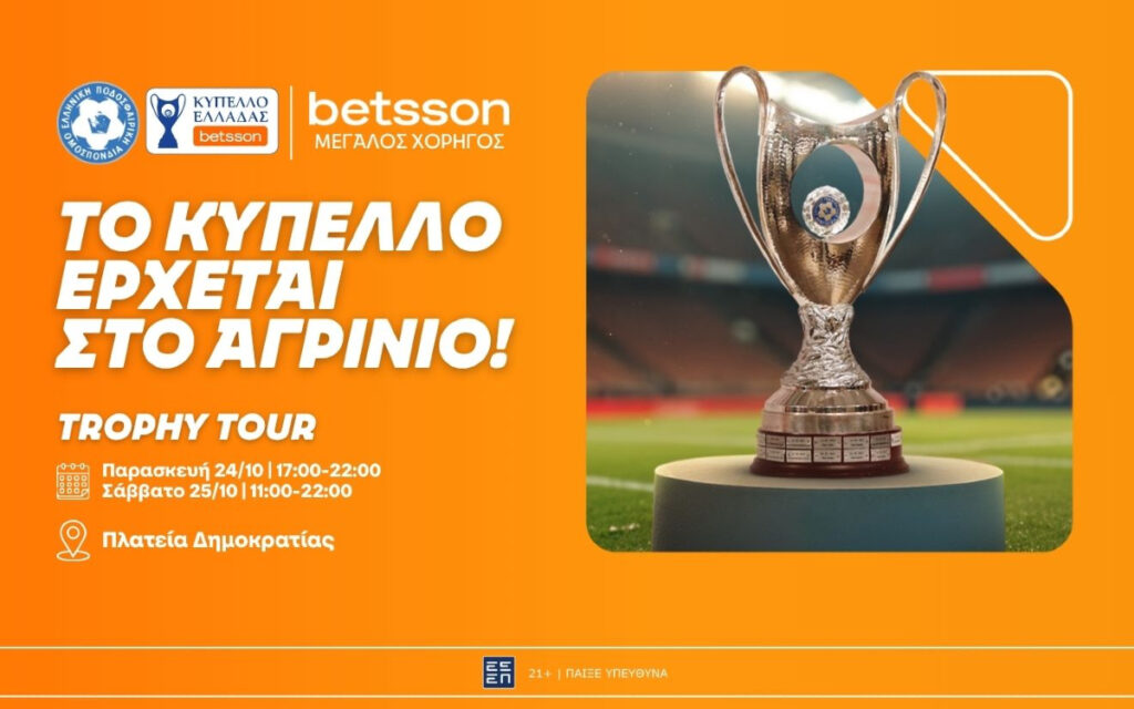 Η Betsson, Μεγάλος Χορηγός του Κυπέλλου Ελλάδας Betsson, σε συνεργασία με την Ελληνική Ποδοσφαιρική Ομοσπονδία, μεταφέρει για ακόμη μία φορά τον παλμό του θεσμού σε πόλεις της Ελλάδας, με στόχο να φέρει τους φιλάθλους κοντά στη διοργάνωση και τις αξίες που πρεσβεύει το ποδόσφαιρο.