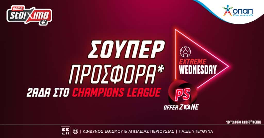 *Ισχύουν Όροι και Προϋποθέσεις. **Ισχύει για την αγορά «Τελικό Αποτέλεσμα-Ενισχυμένες Αποδόσεις» και «Τελικό Αποτέλεσμα-Νικητής Αγώνα» έως την έναρξη του αγώνα. «21+ |Αρμόδιος Ρυθμιστής ΕΕΕΠ | Κίνδυνος εθισμού & απώλειας περιουσίας | ΓΡΑΜΜΗ ΣΤΗΡΙΞΗΣ: 1114| Παίξε Υπεύθυνα |».