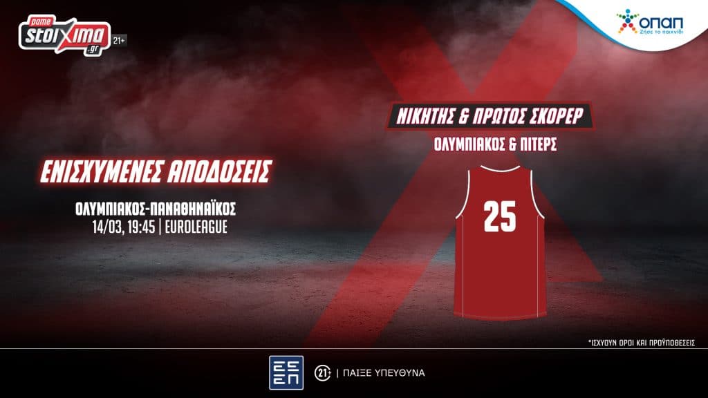 *Ισχύουν Όροι και Προϋποθέσεις. **Ισχύει για την αγορά «Τελικό Αποτέλεσμα-Ενισχυμένες Αποδόσεις» έως την έναρξη του αγώνα. «21+ |Αρμόδιος Ρυθμιστής ΕΕΕΠ | Κίνδυνος εθισμού & απώλειας περιουσίας | ΓΡΑΜΜΗ ΣΤΗΡΙΞΗΣ: 1114| Παίξε Υπεύθυνα |».