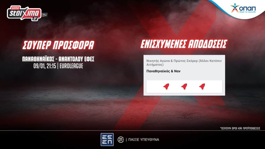 *Ισχύουν Όροι και Προϋποθέσεις. **Ισχύει για την αγορά «Τελικό Αποτέλεσμα-Ενισχυμένες Αποδόσεις» έως την έναρξη του αγώνα. «21+ |Αρμόδιος Ρυθμιστής ΕΕΕΠ | Κίνδυνος εθισμού & απώλειας περιουσίας | ΓΡΑΜΜΗ ΣΤΗΡΙΞΗΣ: 1114| Παίξε Υπεύθυνα |».