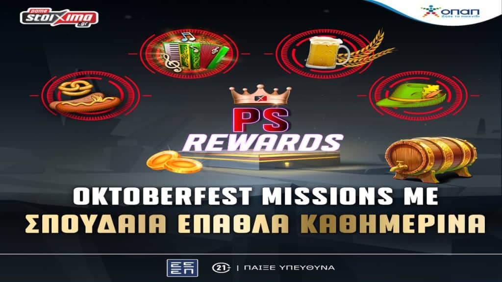 Το πρόγραμμα επιβράβευσης PS Rewards σε περιμένει με μοναδικά challenges* με άρωμα Oktoberfest, τα οποία προσφέρουν καθημερινά μοναδικά έπαθλα*, για να διασκεδάσεις στο Pamestoixima.gr.