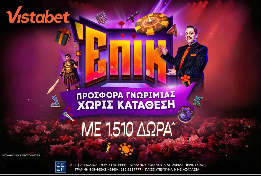Η επική προσφορά* γνωριμίας της Vistabet που μοιράζει 1.510 δώρα*, για να μπεις σαν… άρχοντας στο παιχνίδι είναι εδώ και σε βάζει πρώτο τραπέζι πίστα! Στο Live Casino της Vistabet η διασκέδαση είναι σπέσιαλ με καθημερινές στοιχηματικές προσφορές* κι εκπλήξεις. Με ελληνικά τραπέζια Ρουλέτας και Μπλάκτζακ. Με επιλογές που σε «ταξιδεύουν» σ’ όλο τον πλανήτη μέσα όπως η American Roulette ή η Roleta Brasil!