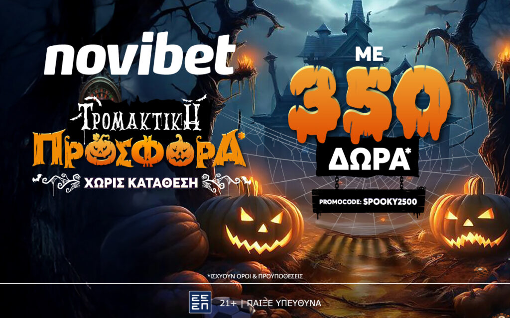 Η Novibet συνεχίζει να πρωτοπορεί στην δημιουργία μοναδικών προσφορών* και προσφέρει μία ολοκληρωμένη εμπειρία παιχνιδιού στο κοινό που την επιλέγει για την διασκέδασή του. Στην προσπάθεια περαιτέρω αναβάθμισης των υπηρεσιών της, λανσάρει μία νέα, σούπερ… τρομακτική προσφορά* χωρίς κατάθεση, που θα είναι διαθέσιμη στην πλατφόρμα της έως και την Τετάρτη 5 Νοεμβρίου (23.59)!